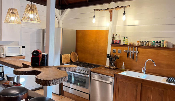 Grande terrasse avec un coin détente ( salon et hamac), un coin repas spacieux et une cuisine équipée et toute ouverte sur le jardin tropical